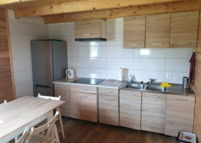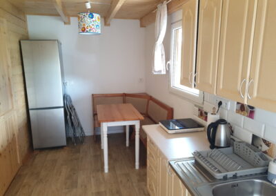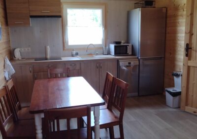 - kuchnia z jadalnią: stół, płyta indukcyjna jedno palnikowa, mikrofala, opiekacz do kanapek, duża lodówka z zamrażalnikiem, czajnik, naczynia oraz garnki