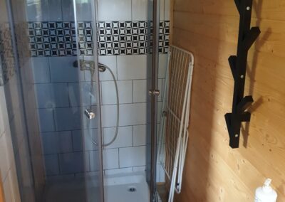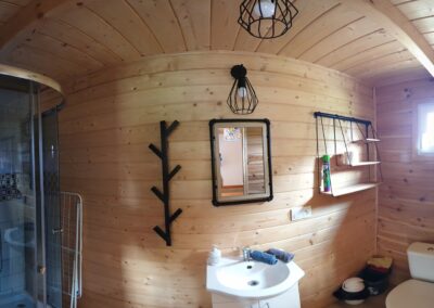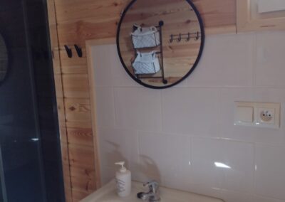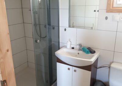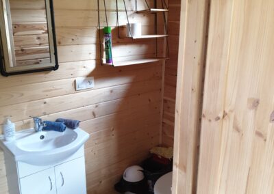 - łazienka wyposażona w kabinę prysznicową, umywalkę toaleta, suszarka rozkładana, miednica.