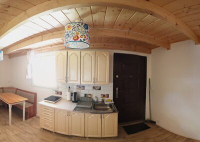 - kuchnia : stół, płyta indukcyjna dwu palnikowa, lodówka z zamrażalnikiem, zmywarka, kuchenka mikrofalowa czajnik, opiekacz do kanapek, naczynia oraz garnki, deska do prasowania i żelazko